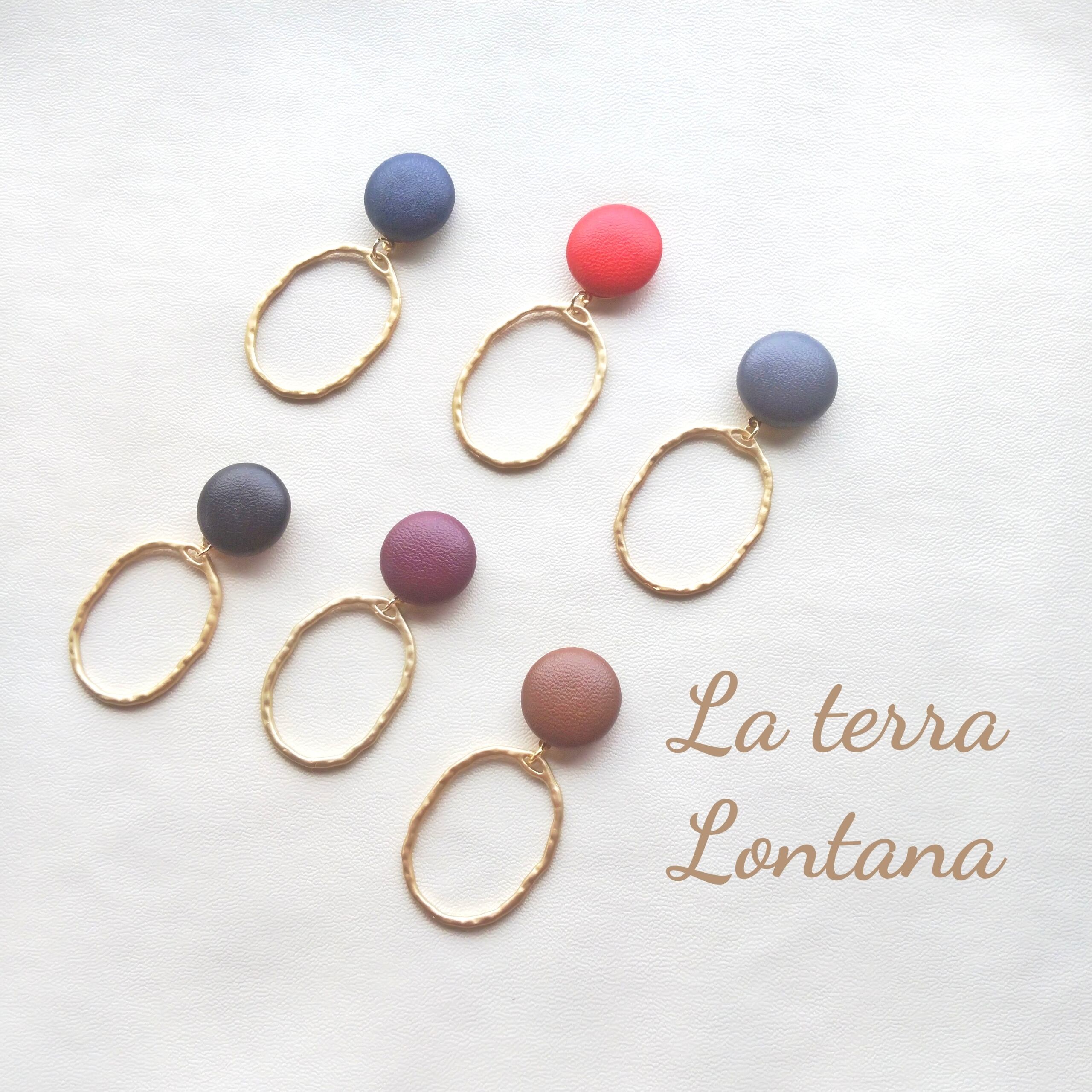 レザーカボションとマットな変形ゴールドフープを合わせた秋冬にピッタリのピアス・イヤリングです。